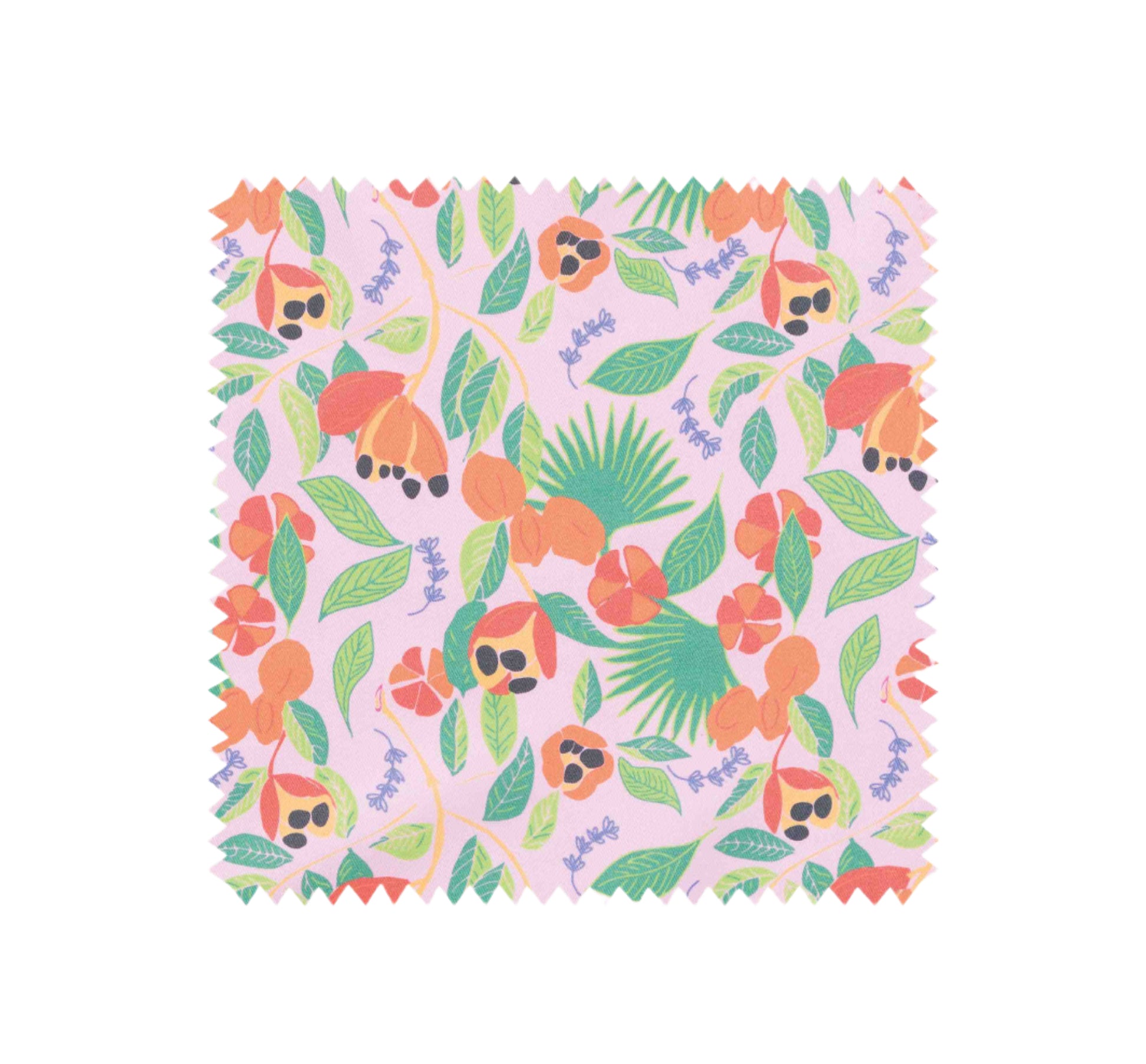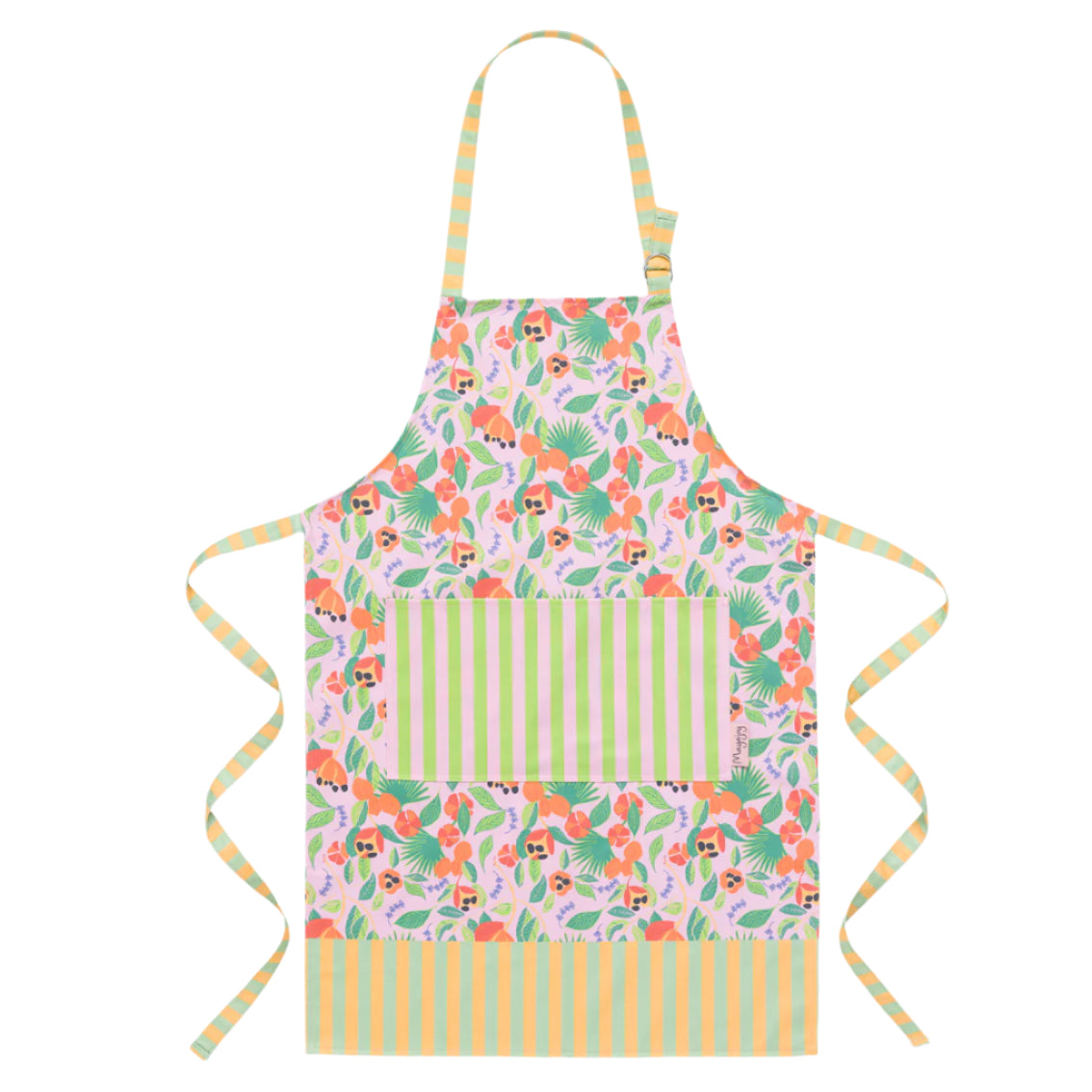 The vibrant all-over ackee pattern sits against a soft pink background with bold & contrasting stripes to the skirt, pocket, and neck tie- making this a statement apron that’s not only practical but joyful too.