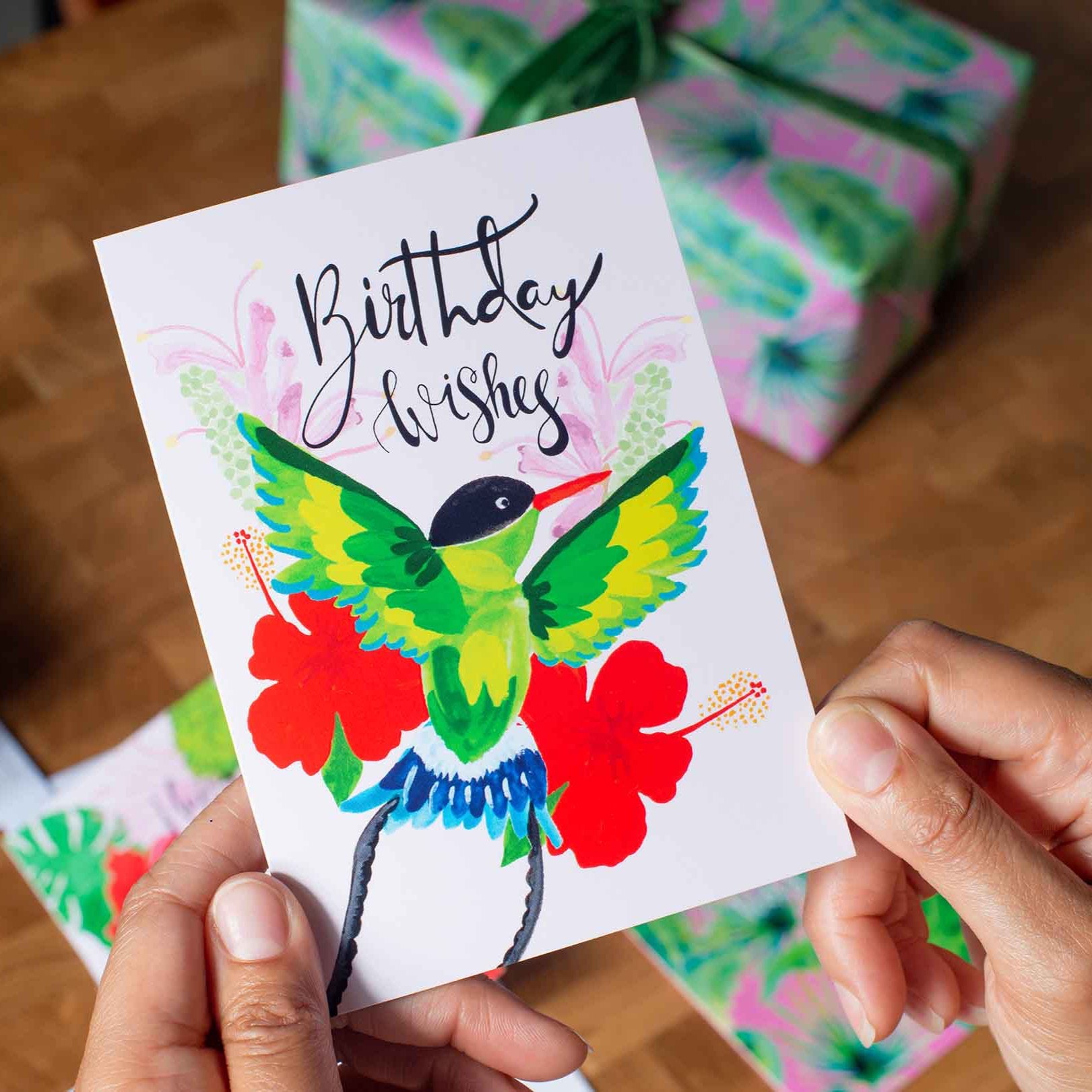 Our Birthday wishes Hummingbird card featues a hand painted Jamaican "dr bird" and tropical florals. Native to the island of Jamaica, our colourful hummingbird design is playful and brings feel good vibes to any Birthday bash.