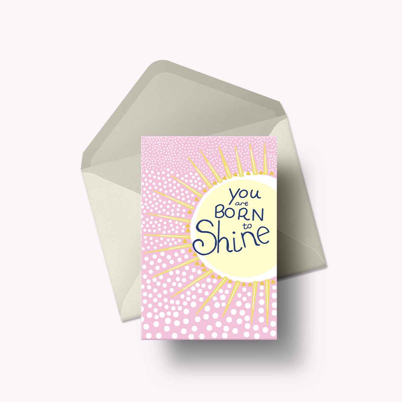 Our born to shine card features a pastel sun with pink and white dotted background and hand written lettering.