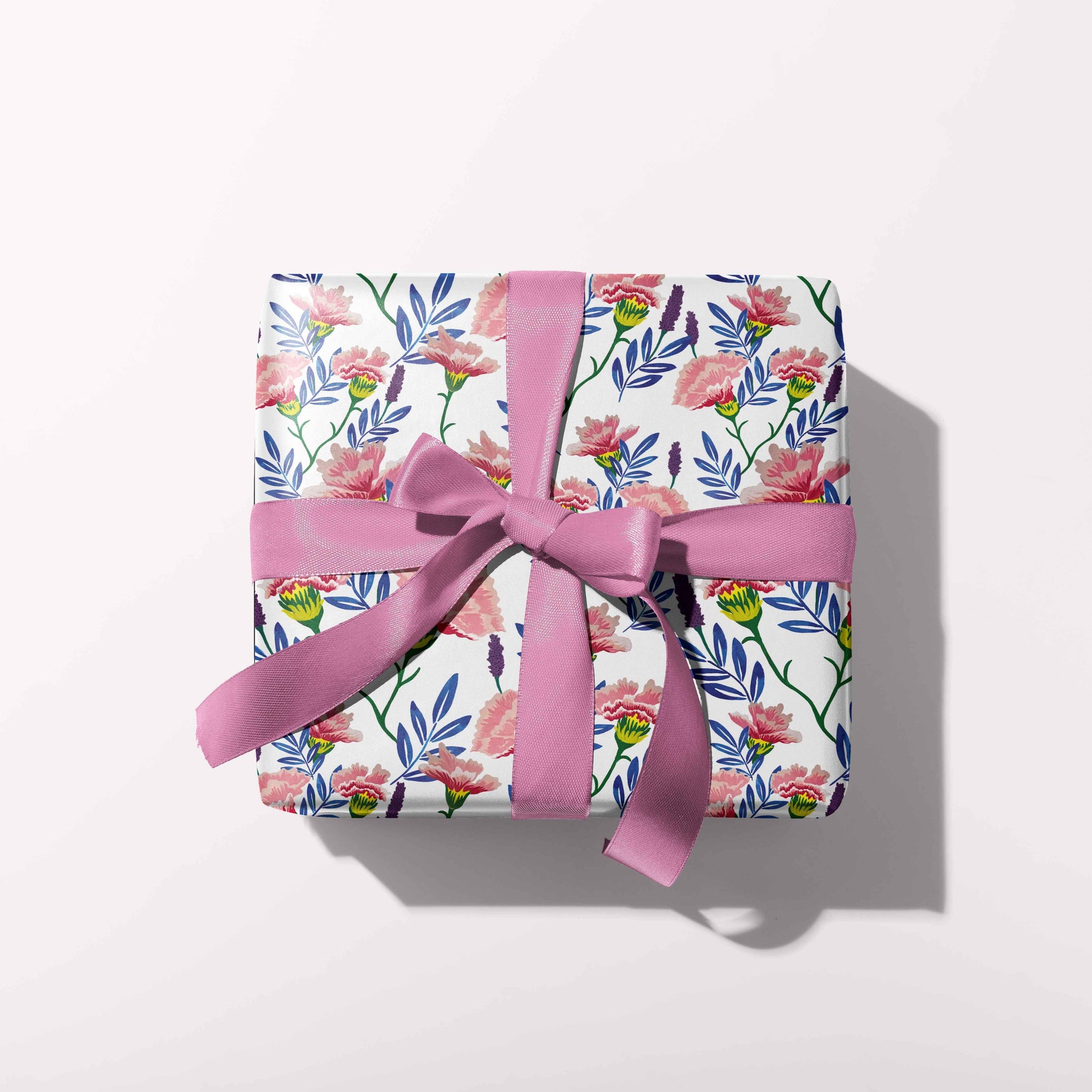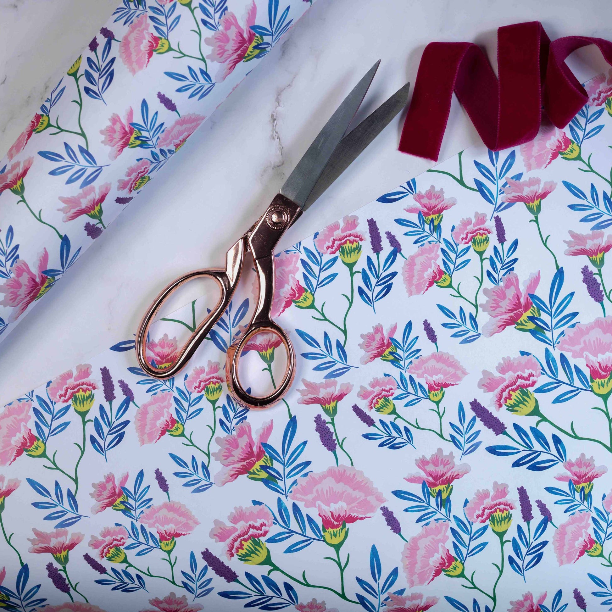 Pack of 2 luxury wrapping paper sheets, featuring a hand painted spring time carnation pattern in beautiful shades of pink, blue and contrasting green. Each sheet is printed onto beautifully thick paper to elevate your gift giving experience.