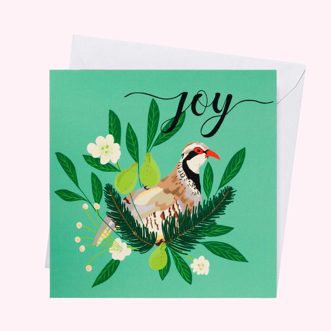 Our Christmas joy card features a hand drawn Partridge design and hand calligraphy on a festive green background.