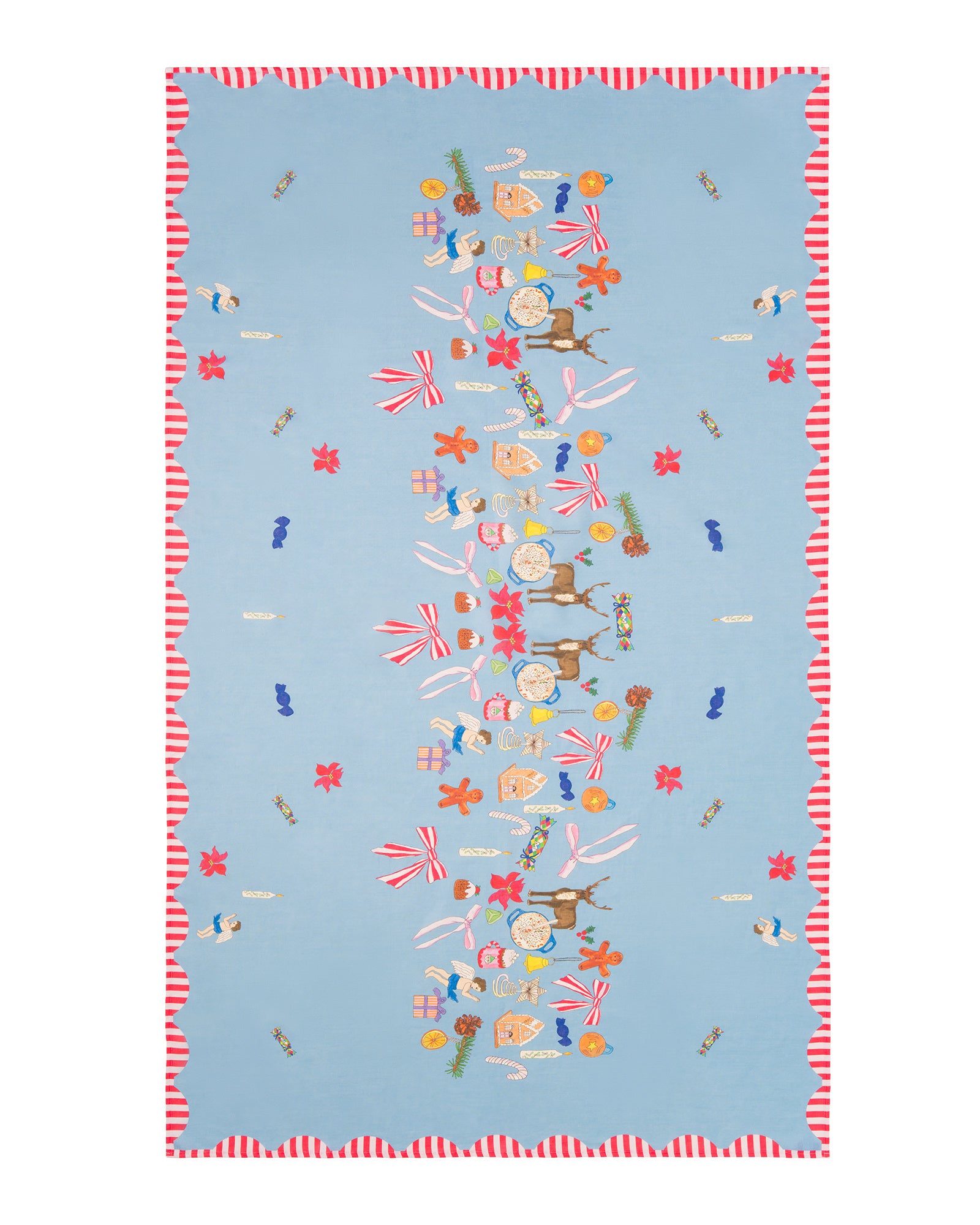 The tablecloth features a hand-painted nostalgic print with a playful scalloped candy-stripe edge, while the napkins echo the same blue cotton-linen with candy-striped trim. Together, they create a table setting that celebrates family, heritage, and colour.
