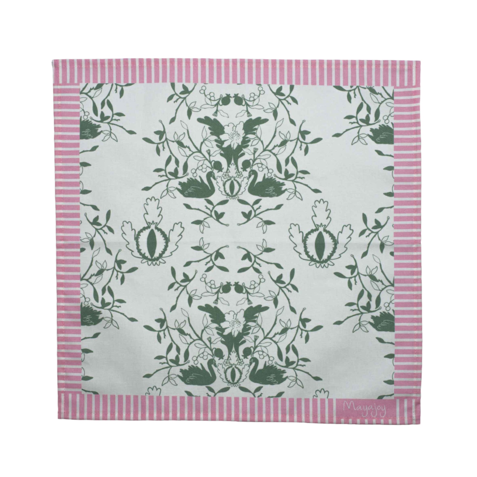 Contrast is what we do best. Bringing bold colour and a traditional winter motif, these beautiful Christmas, cotton calico napkins feature a hand painted Swan and Pomegranate design with a pastel pink striped border, to add a contemporary edge.