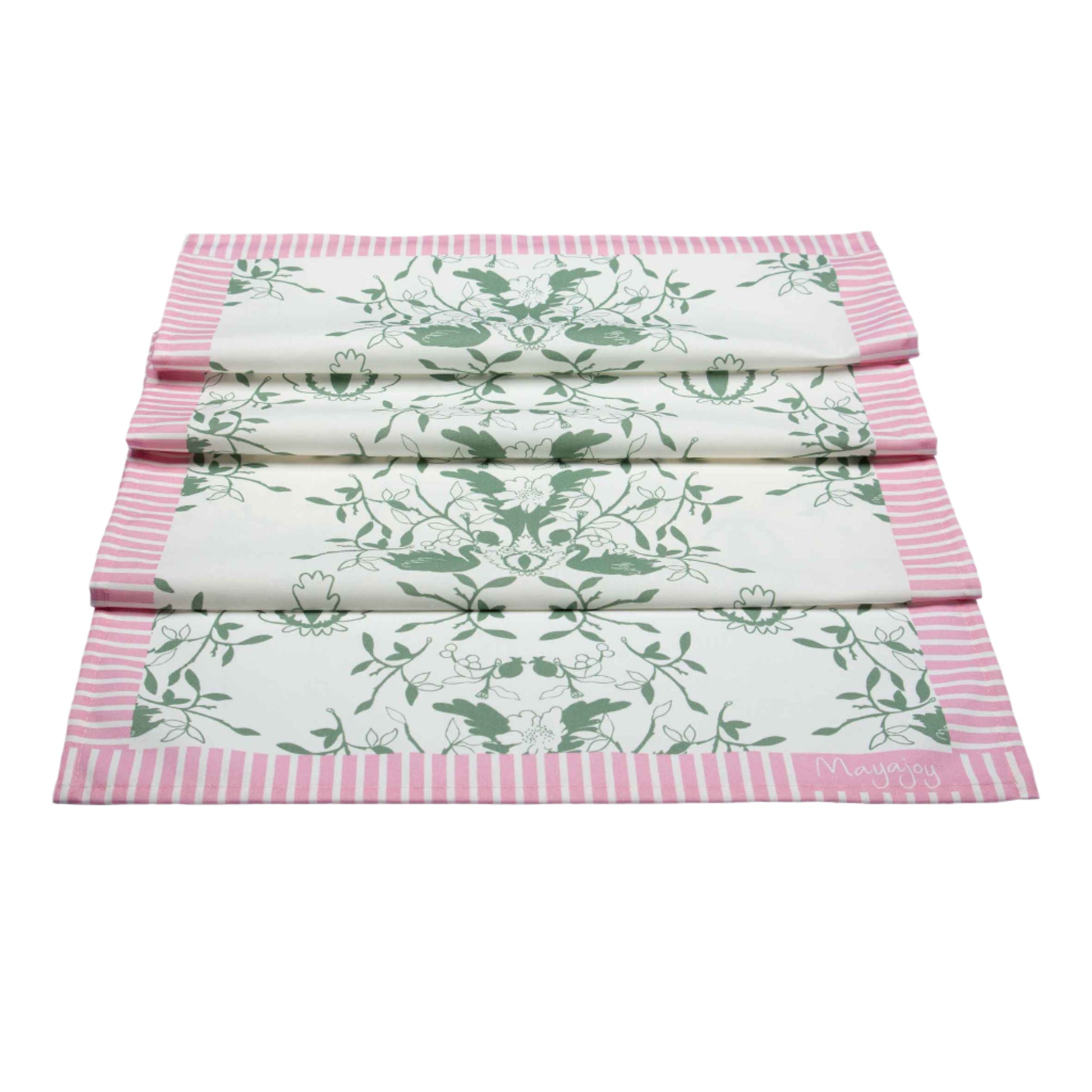 Combining traditional design with modern flare, our Christmas Swan cotton table runner has a natural background and hand painted sage green Swan & Poinsettia motif, finished with a pastel pink & striped border, adding a contemporary edge.