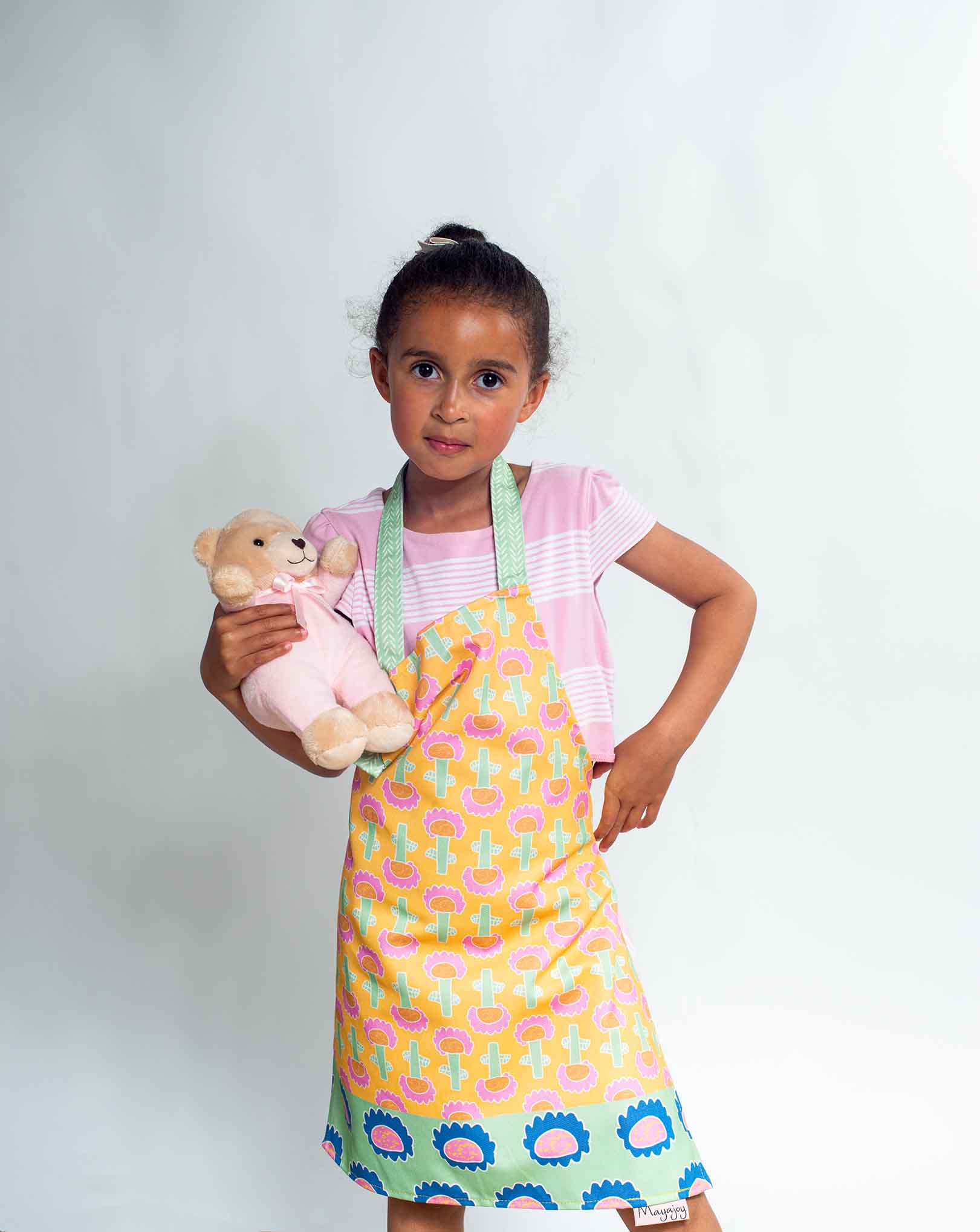 Set on a bright yellow background with bold contrast ties and our signature flower power trim, it’s fun, vibrant, and totally one of a kind. A perfect gift for budding bakers, mini chefs, or anyone who loves to get messy in the kitchen.