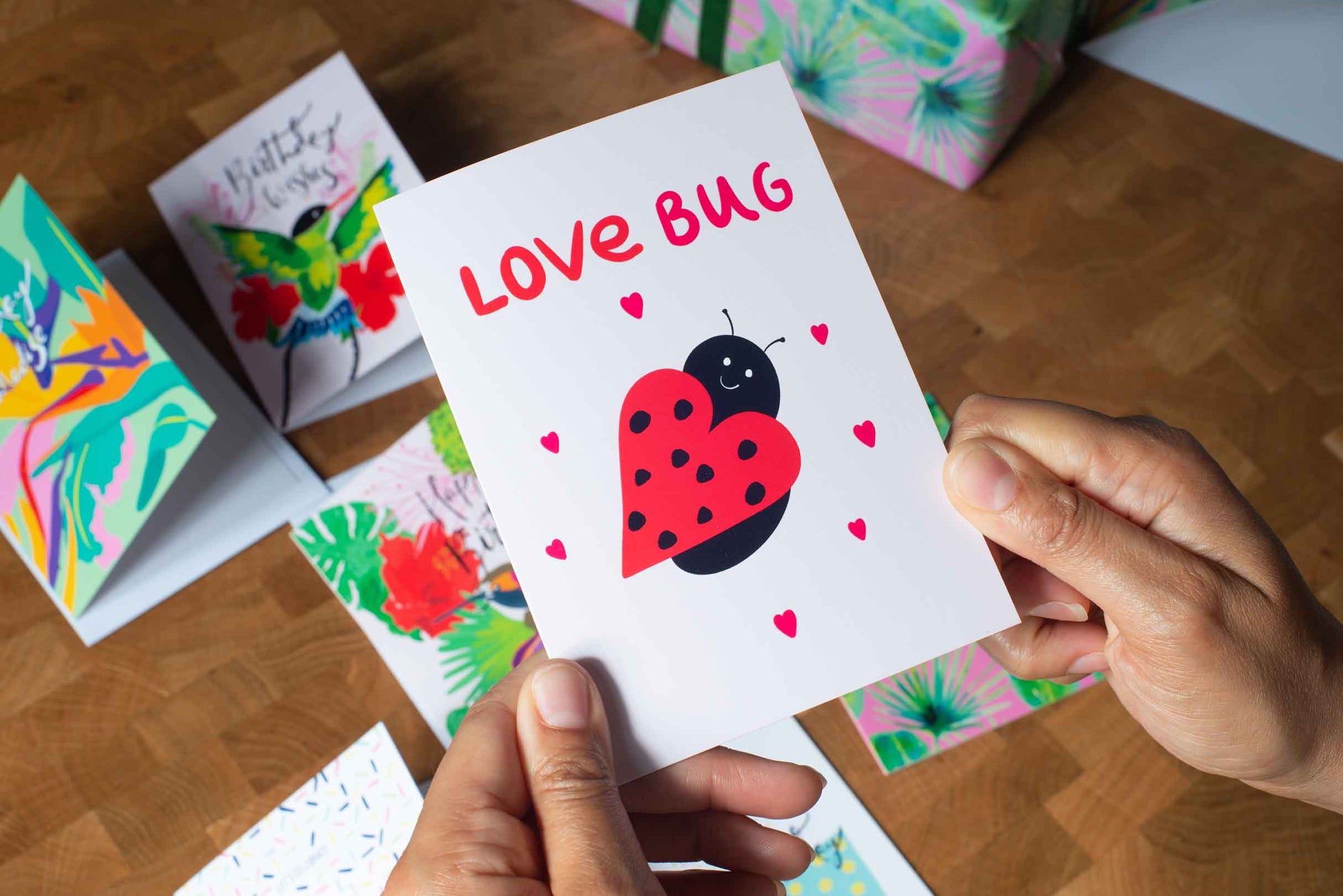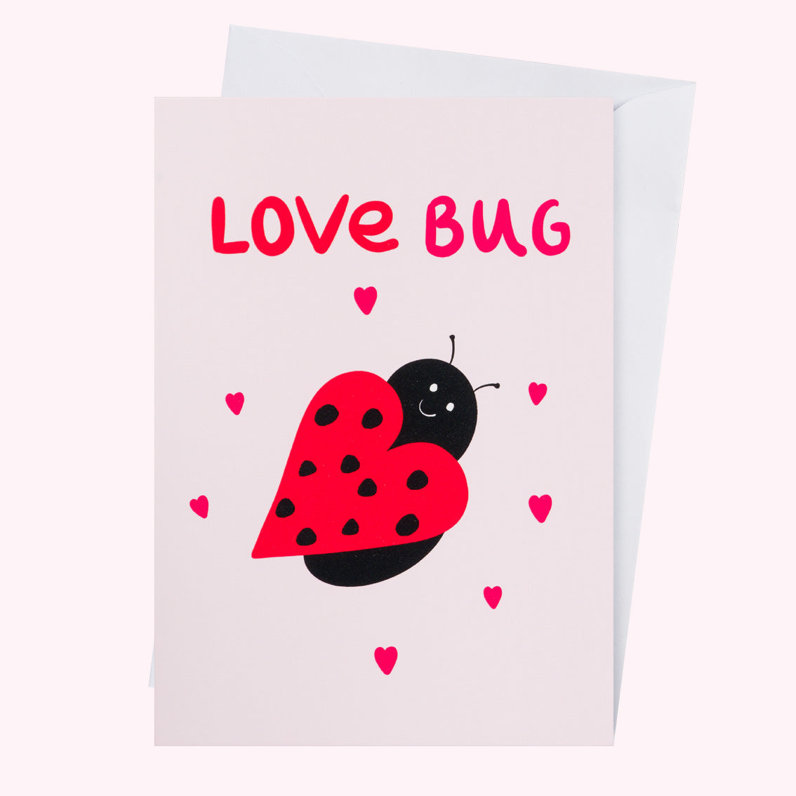Our love bug card is cute & cheerful, featuring a hand illustrated lady bug and heart design, as well as hand drawn lettering.