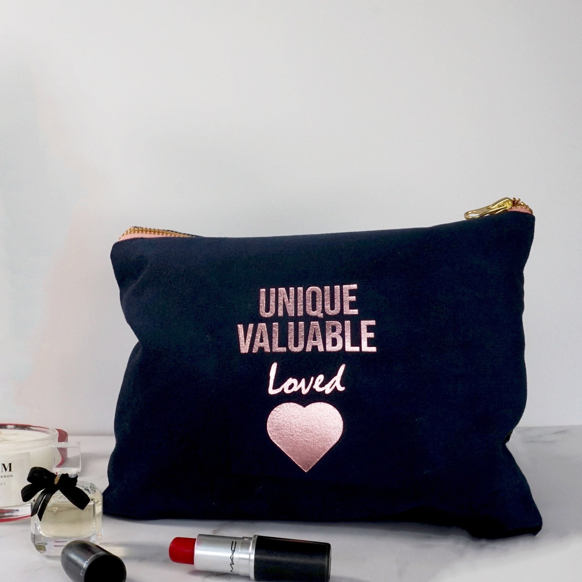Featuring our Unique, Valuable, Loved slogan- these 3 words started the Mayajoy family brand. From daily affirmations to a belief that other women needed to believe in their own worth- this is more than a make up bag- it’s a small reminder. Keep it close. Carry it daily. Pass it on.