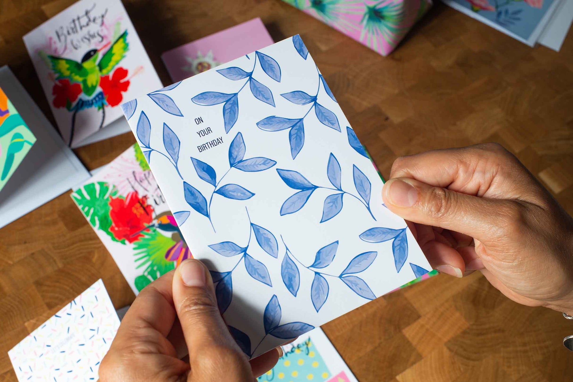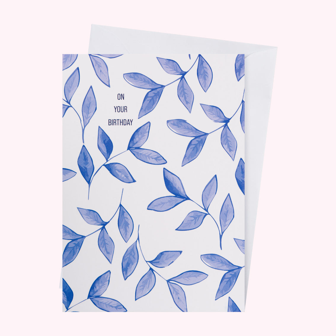 Our blue leaves birthday card features hand painted inky blue leaves on a beautifuly thick white card.