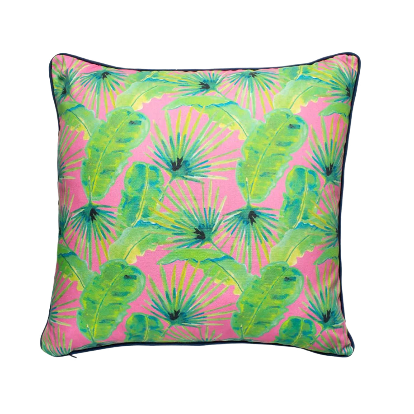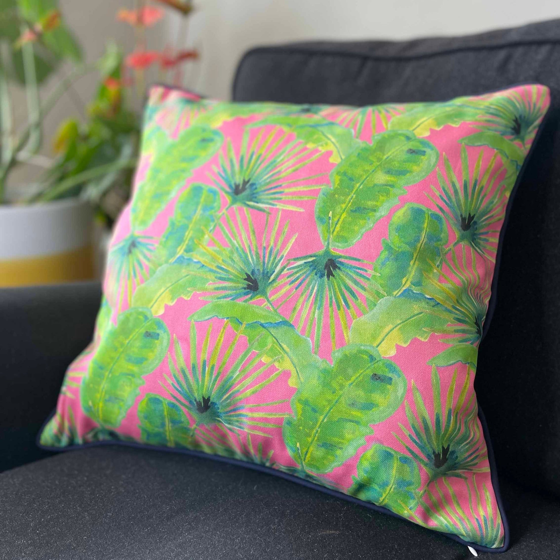 This colourful cushion is sure to make you smile. Perfect for Maximalists and those who favour a splash of colour, our pink palm cushion will add some playful flair to any room. Inspired by the island of Jamaica, this Pink palm print features a hand painted ink foliage design, bringing a hint of the tropics to Great Britain. Using our signature contrast colours, this cushion will be a topic of conversation and bring happy and joyful vibes to even the dreariest of days. With a bright pink background and double sided design this 45cm square cushion is piped in dark navy, which finishes this show stopping piece off perfectly. This cushion includes a feather cushion pad.
