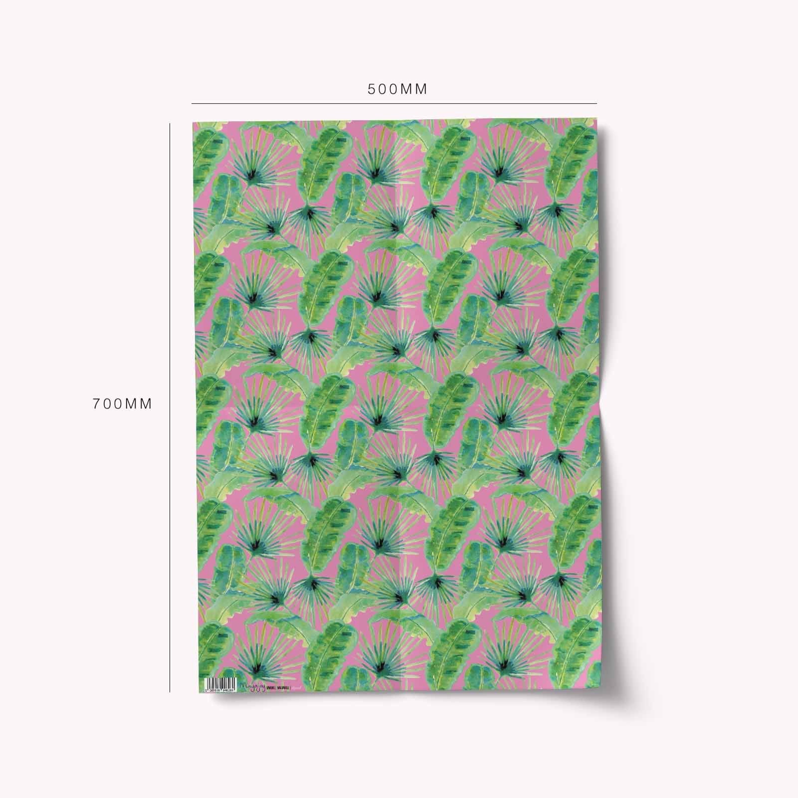 Pack of 2 luxury wrapping paper sheets, featuring a hand painted Palm & banana leaf pattern. Each sheet is printed onto beautifully thick paper to compliment your gifts.