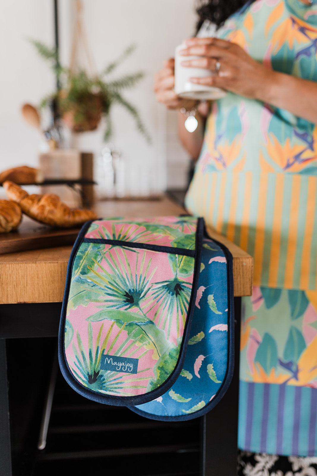 Our Pink Palm oven gloves have a thick insulation, protecting your hands from hot temperatures, and feature a vibrant hand painted palm leave pattern. Inspired by the island of Jamaica, with its care free & relaxed atmosphere, our kitchenware is designed to bring elements of the outdoors in, to give you a dopamine boost and add a playful element to your kitchen design.