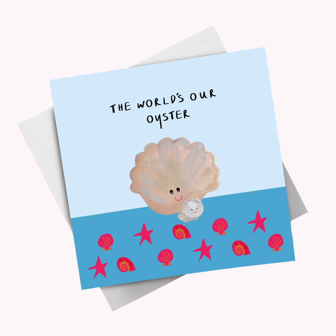 Our World is our oyster card fetaures a hand painted Oyster shell & pearl on a dual blue background.