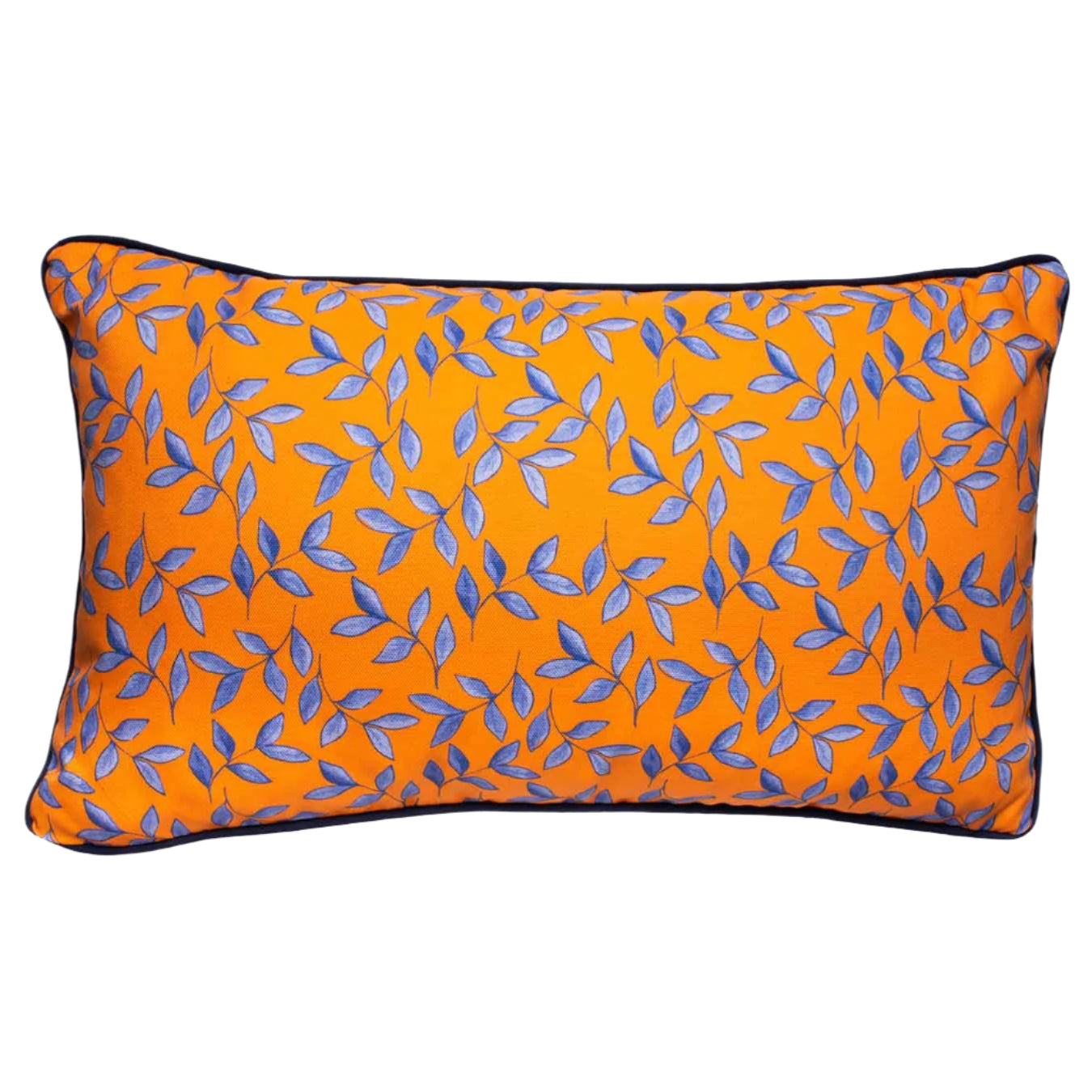 This simply stunning cushion brings the best of British and is a nod to our dual heritage. Perfect for those who favour maximalist schemes or simply a splash of colour, our winter sun cushion will add a touch of elegancy to any room. Inspired by winter sunrises and sunsets in the South West of England, this leafy print features a hand painted ink design, bringing classic simplicity to your scheme. Using our signature contrast colours, this cushion will be a topic of conversation and bring happy and joyful vibes to even the dreariest of days. This 50x30cm rectangular cushion is piped in dark navy, which finishes this show stopping piece off perfectly. This cushion is available with the option of a feather cushion pad and compliments our 50cm square Blue leaves cushion perfectly.