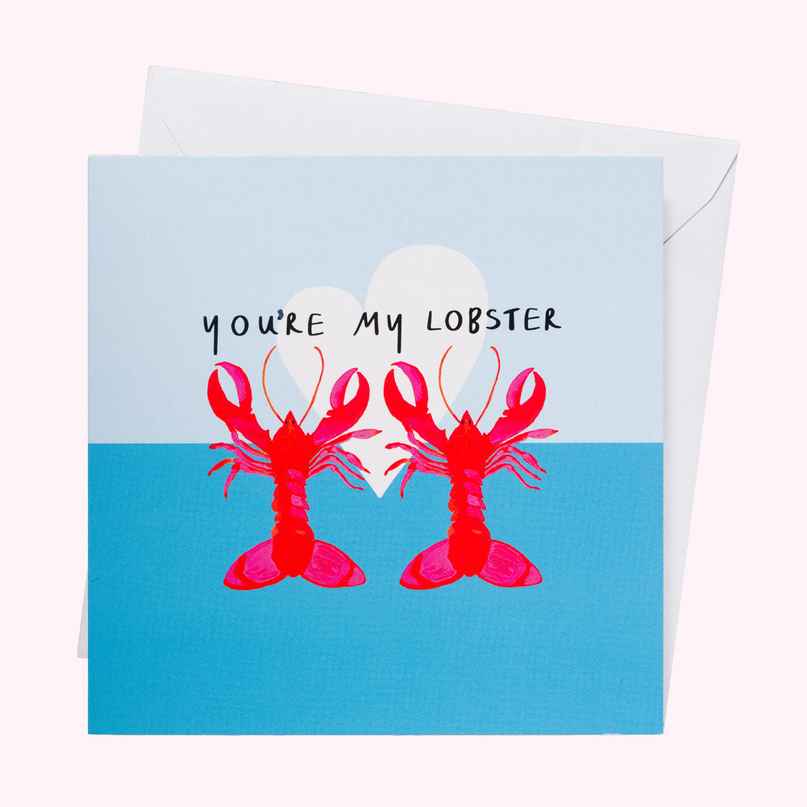 Our You're my Lobster cards features a hand painted pair of lobsters with a white heart on a dual blue background. For 'Friend's fanatatics and your life long mate.